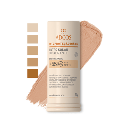 “O Filtro Solar Tonalizante FPS 55 Base Stick é um protetor solar com cor que une a função de dois produtos em um só: garante cobertura intensa e disfarce imediato de imperfeições da pele do rosto e ainda possui alta proteção solar contra raios UV e luz visível com FPS 55. Indicada para todos os tipos de pele, a Base Stick proporciona toque seco e efeito mate, além de atuar como maquiagem. Por ter alta resistência à água, esse filtro solar em bastão é o dermocosmético ideal também para pessoas que praticam atividades ao ar livre e para pós procedimentos, como laser e peeling, pois acalma, reduz ardência e disfarça a vermelhidão. Não é comedogênico, não escorre nos olhos e sua embalagem é prática e portátil, permitindo fácil aplicação. Está disponível em 5 tonalidades.”